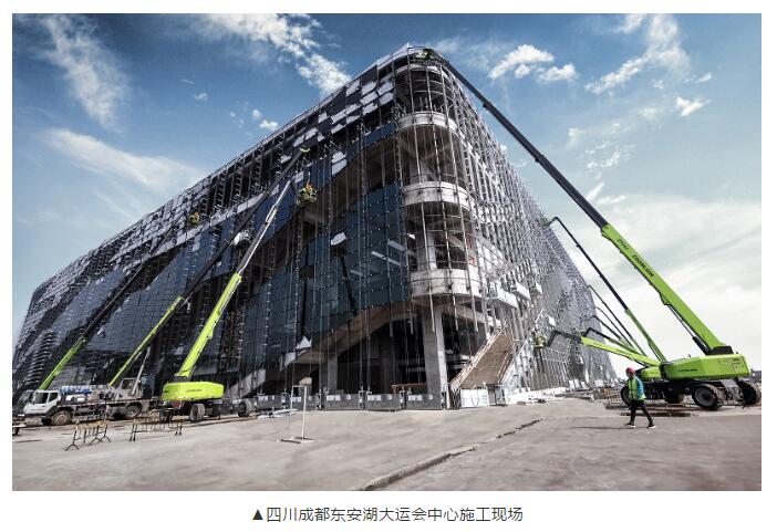 在四川成都東安湖大運(yùn)會(huì)中心工程項(xiàng)目上,幾十臺(tái)綠色的機(jī)器格外亮眼,它們伸展大臂,擺開(kāi)陣勢(shì),正在緊張有序地進(jìn)行外立面玻璃幕墻的安裝施工。
