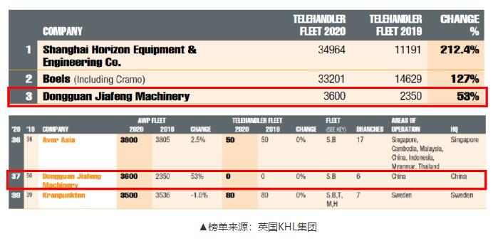 2020年7月7日國(guó)際知名行業(yè)評(píng)價(jià)機(jī)構(gòu)KHL集團(tuán)對(duì)外發(fā)布了一年一度的“全球高空作業(yè)機(jī)械租賃50強(qiáng)排行榜”(簡(jiǎn)稱Access 50),東莞市家鋒機(jī)械有限公司排名第37名,并在全球成長(zhǎng)最快租賃公司中榮獲第三。榜單主要反映企業(yè)機(jī)隊(duì)規(guī)模與全球高空作業(yè)機(jī)械租賃的市場(chǎng)情況。