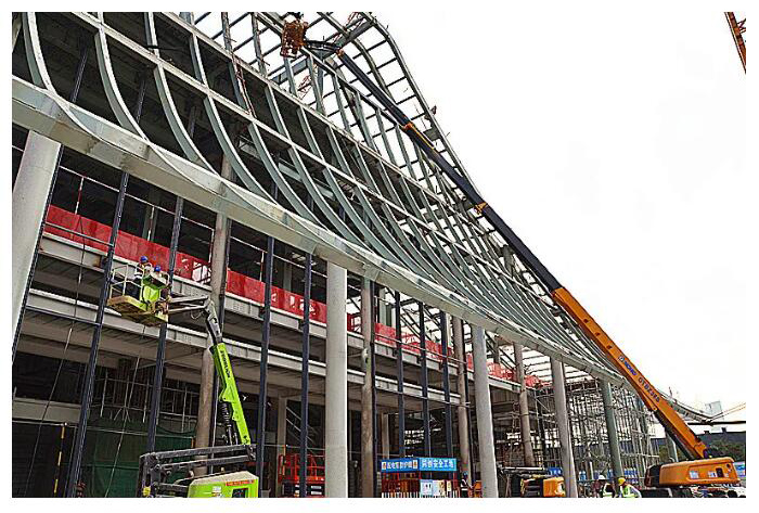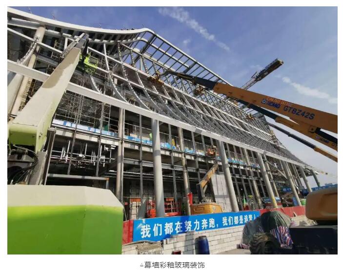 深圳前海國際會(huì)議中心項(xiàng)目屋面幕墻為迭級(jí)式玻璃幕墻單元系統(tǒng),彎弧屋面彩釉幕墻采用1.5×9米的超長板塊,面積超過一個(gè)足球場(chǎng)的大小,是全國最大也是首個(gè)采用現(xiàn)代材料彩釉玻璃來演繹傳統(tǒng)屋面的建筑,同時(shí)項(xiàng)目要求37天完成彎弧屋面彩釉幕墻工程的封閉,60天完成大面幕墻安裝,80天具備竣工驗(yàn)收條件。