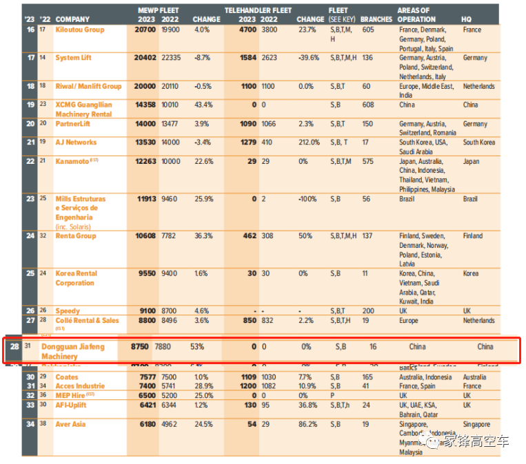 日前,國際著名的工程機械信息提供商—英國KHL集團發(fā)布了2023年“全球高空作業(yè)機械租賃50強排行榜”。東莞家鋒憑借穩(wěn)健高質(zhì)量的發(fā)展再次成功入榜,名列全球第28位,較去年提升3位,全球排名再度升級!